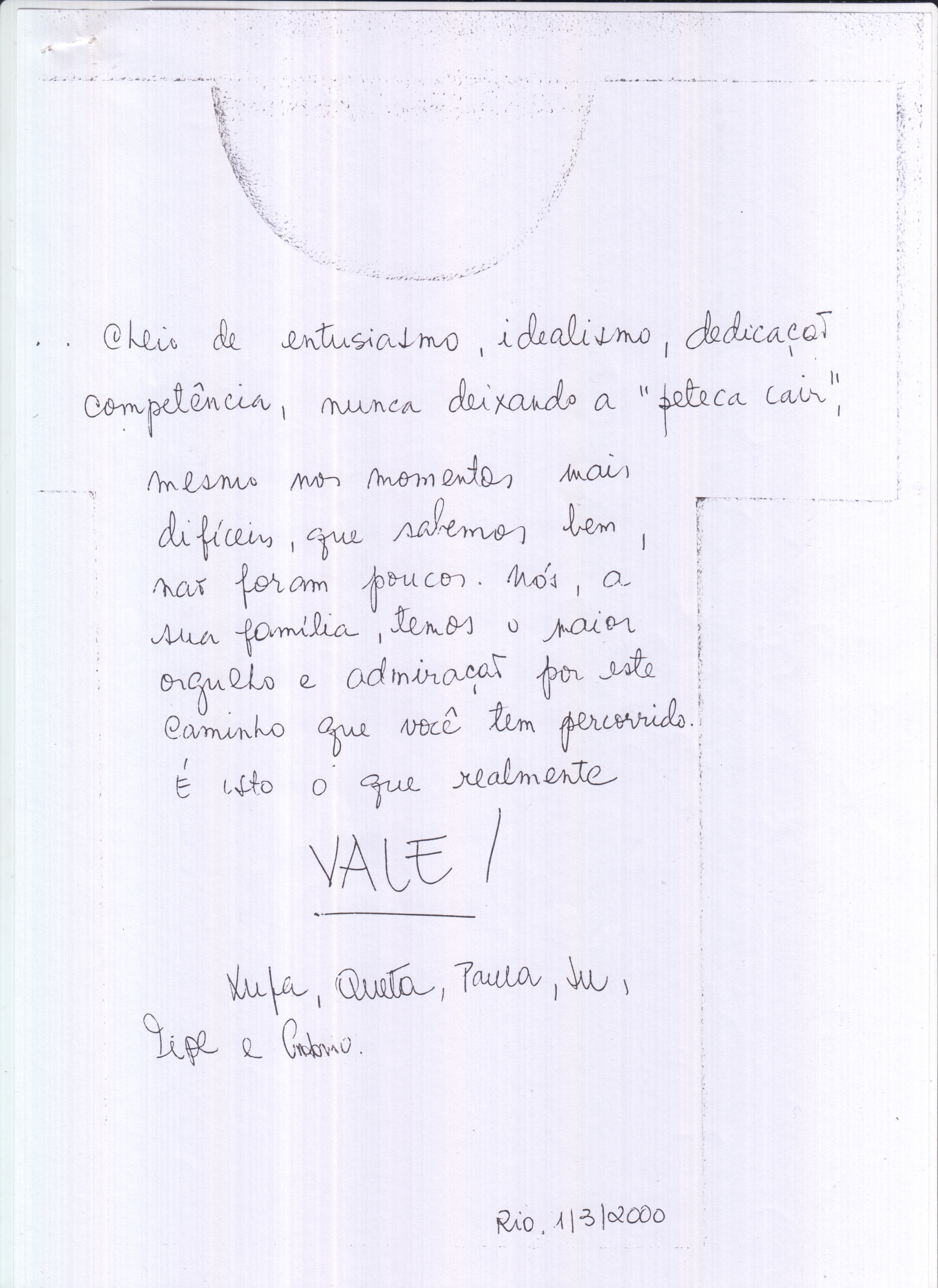R – Claro que tenho. Eu achei esse documento, sabe que esse documento inclusive me deu tempo de serviço que eu estava requerendo no INSS e não conseguia. Sabe que documento é esse? A minha proposta de emprego na Vale do Rio Doce. Eu estava querendo um tempo de estágio nesse escritório do Cantidiano e outros escritórios e eu não tinha como comprovar, porque os escritórios já tinham fechado, desapareceram tal, aí eu fui ver na minha proposta de emprego, a minha declaração. Porra, eu não iria inventar, em 1970, que eu tinha trabalhado num escritório para fazer prova no INSS. Aí os caras, porra, viram aquele negócio, me deram três anos que eu estava precisando de tempo de estágio graças a esse documento.