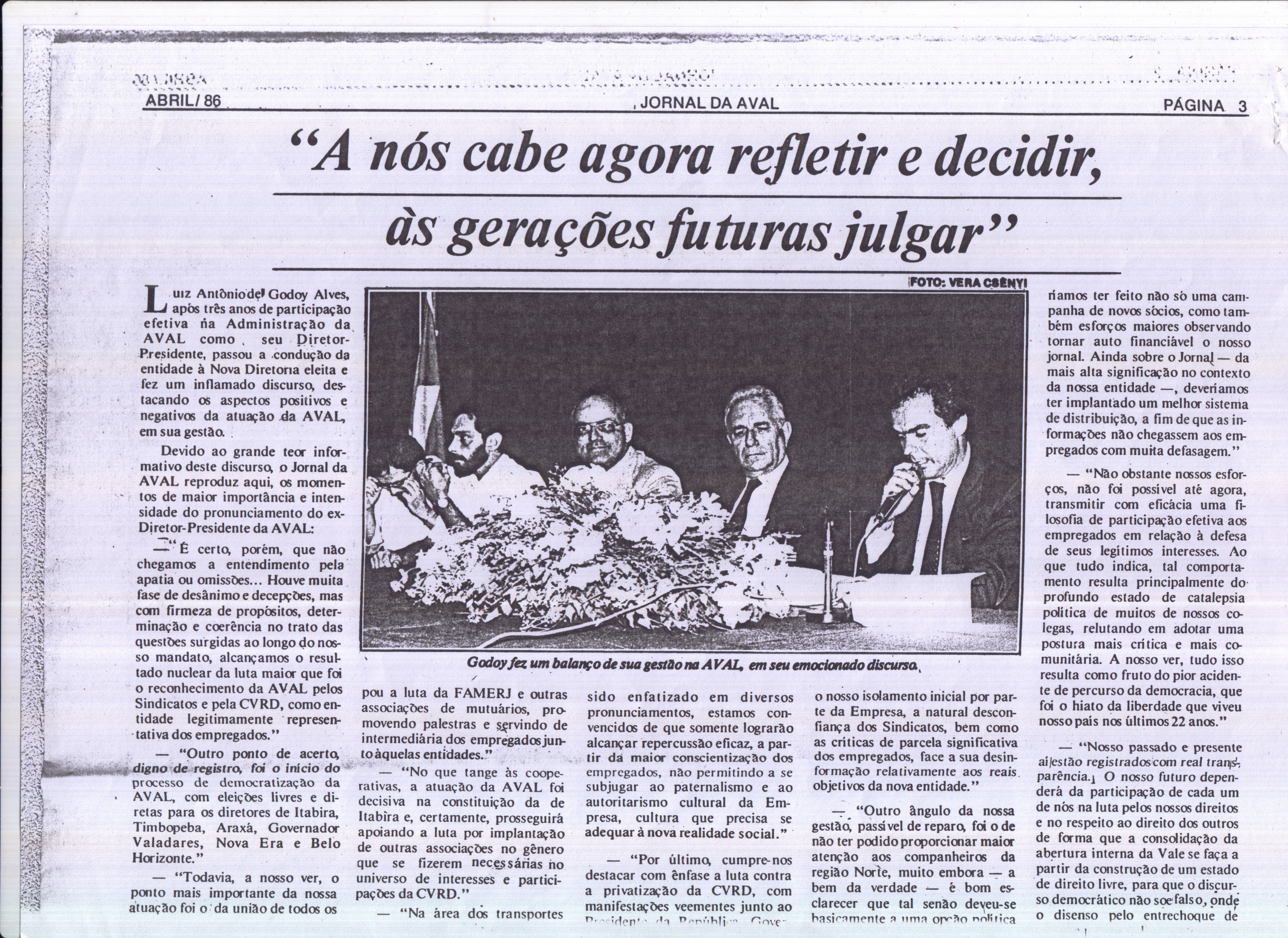 R – É, eu acho que a Karen leu. Vou ver se eu tenho esse documento. E foi um documento muito forte, porque ele retratava não só a minha visão da coisa, mas retratava a visão de muita gente, inclusive a do povo. Eu fiz muitas pesquisas, até em botequim, no Vilarino, por exemplo, pesquisava muito lá, aquela pinguçada toda, que ali você tinha de tudo, você tinha de médico, advogado, jornalista, piranha, tinha o diabo, pintava tudo ali e todo mundo deu os depoimentos, então foi um negócio legal, não foi só a minha opinião, mas um consenso das pessoas e evidentemente um pensamento... Bom, nessa época quando eu terminei essa passagem lá na Aval, porque a Aval foi construída justamente para defender a Vale do Rio Doce da privatização. Nós éramos só gerentes que montaram essa..., fizemos uma diretoria provisória, um dia eu cheguei na reunião e falei: “Esse negócio está sem comando meu amigo, não se pode fazer nada sem comando. Vamos indicar aqui um comandante desse processo porque o negócio não está bom não”. Enfim, aconteceram algumas entrevistas e nós fomos, eu e o Luciano Taus, nós éramos os comandantes desse processo, e depois aconteceram duas assembleias e eu me sobressaí e o pessoal me indicou, eu recebi setenta e cinco por cento dos votos, então eu estava bem com a galera. Trabalhei dois anos nessa associação, me dediquei muito, trabalhei muito, muito mesmo e tomei muito cassete por causa dela também. Todo o meu desdobramento profissional depois foi muito marcado pela minha presença na Aval, com isso o cara acaba rotulado: “Orra, esse cara é o agitador, esse cara é complicador”. Não, não era nada disso, nunca fui agitador ou complicador, eu queria aquilo que eu achava que era certo. Agora, os caras queriam que eu fosse presidente de uma associação de empregados e comungasse com a posição da diretoria da Vale, não dava porra! Era aquele negócio absolutamente de confronto: capital e trabalho. Naquela época era pão e vinho, pão e vinho não, preto e branco.