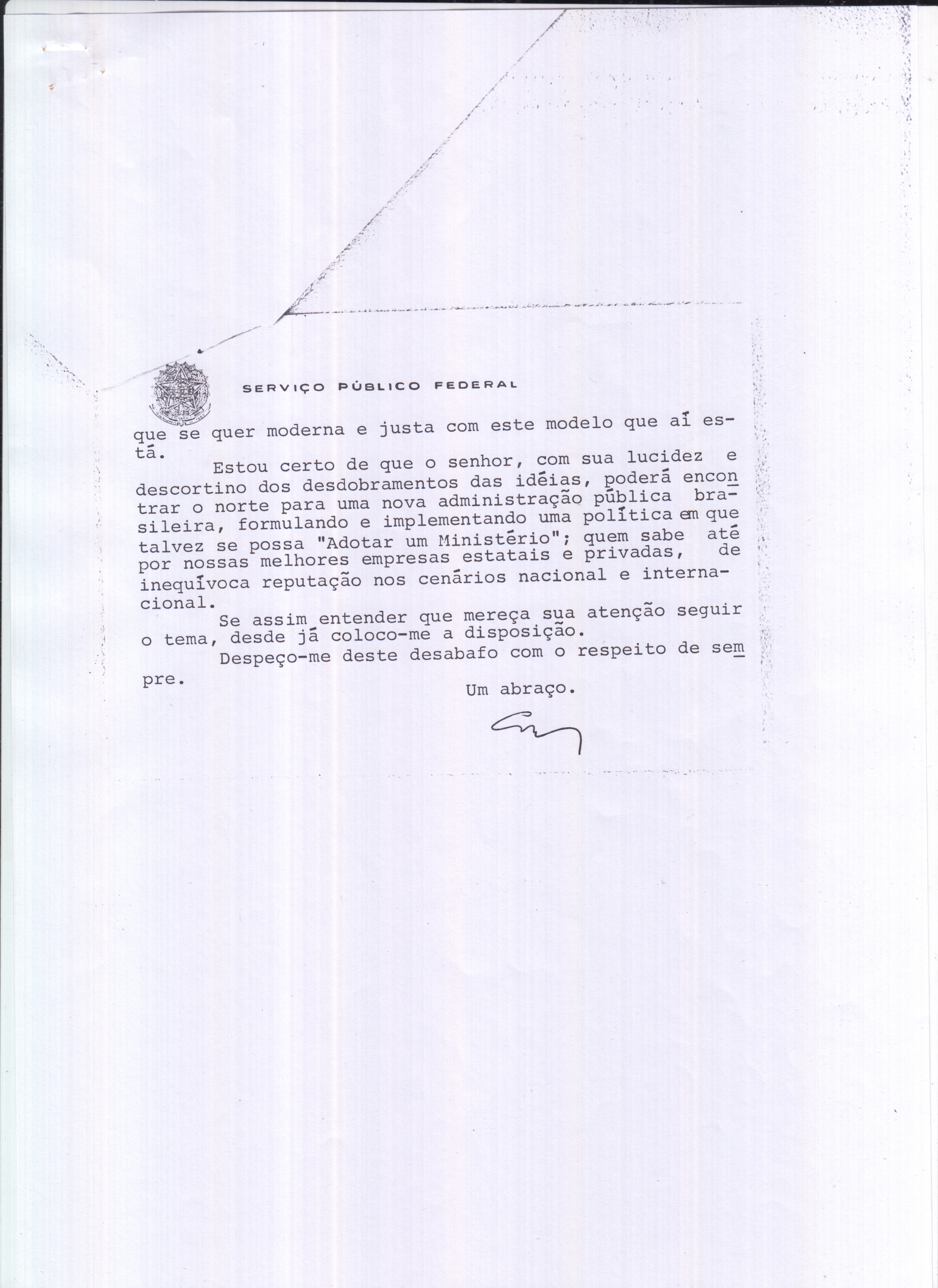 R – Eu fui para Brasília, porque eu fui com o salário duplicado, duplicado e ainda iria ganhar lá como DAS 4 que era um DAS alto, tinha apartamento funcional, enfim, a minha qualidade de vida em termos de salário e condição de trabalho realmente subiu um salto de qualidade fantástico. Nessa época não queriam que eu saísse da Vale de jeito nenhum, mas aí o Wander não queria porque não queria que eu subisse, o Wilson não, o Wilson queria que eu ficasse e o João Manuel, queriam que eu ficasse porque eles sabiam que tinha um trabalho legal ali e bem feito, e o trabalho estava bonito, eu confesso para vocês que a vaidade me mordeu ali, ali foi uma mordida de vaidade sim, porque eu falei: “Vou mostrar pra esses putos aí que eu não preciso deles não, eu tenho estrela própria. Mas eu fui também porque era o dobro do salário, eu ganhava quatro e fui ganhando oito e mais dois que eu ganhava lá, então eu ganhava dez, naquela época nunca vi tanto dinheiro na minha vida. Enfim, fiquei lá...