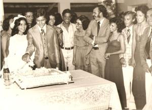 Dados da imagem Foto do casamento de Paula no clube onde aconteceu a recepção. Paula está com seus pais e seu marido.