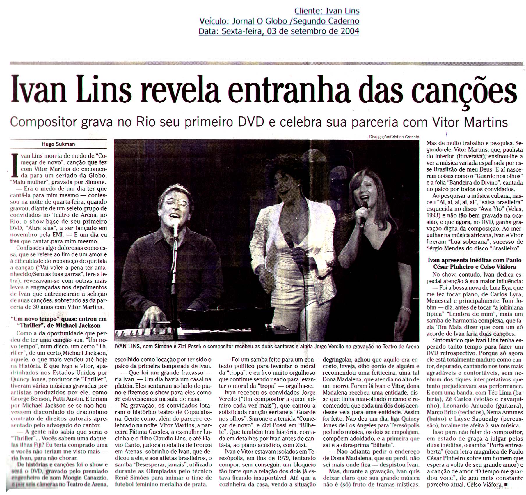 R – Foi maravilhoso! Ele veio com um roteiro lindo, poético, e aí eu arrasei. Eu viajei mesmo. Agora já fiz o segundo filme dele também, que é Bens Confiscados, é uma coisa que eu realmente... Quando eu fui morar em 1992, em Los Angeles, eu fui para tentar fazer música para cinema. O David _____ é muito meu amigo, e o David _____ já fazia – também um dos meus ídolos – música para cinema, e ele me colocou com o empresário dele, me indicou para o empresário dele e fui. Teve uma reunião com os empresários do David _____, que ao mesmo tempo eram do John Willians, só tinha fera ali. Os caras chegaram e falaram: “Olha, meu filho, você, tudo bem.”, ouviram meus discos, eram todos fãs meus como compositor, “Mas música para cinema, você vai precisar de pelo menos uns dois anos trabalhando com publicidade.”, falei: “Eu não vou começar tudo de novo não.”, me deu uma ducha de água fria, eu falei assim: “Entrar nesse clube vai me custar isso tudo? Eu vou voltar para o Brasil!”. Já estava doendo a saudade, foi mais um empurrãozinho, mas o Carlão veio e, de repente, eu realizei meu sonho. Eu lembro quando eu fui assistir. Primeira sessão do Dois Córregos: eu chorava porque foram 30 anos com aquilo assim, ó! Eu chorei os 30 anos, pelos 30 anos de sonhos que eu tive. Eu alimentava fazer música para cinema. Passei o filme todo chorando. Ao meu lado estava o Geraldo ______, grande músico gaúcho, muito meu amigo, grande músico, grande compositor gaúcho. Ele estava ao meu lado, ele falava: “Ivan, você vai ter um troço! Pára de chorar, cara, você está me deixando nervoso!”. Eu vi em Gramado, em uma sessão especial. Eu nunca tinha visto meu filme, um filme com a minha música, abertura com aquela orquestra, Nelson Ayres escreveu os arranjos.