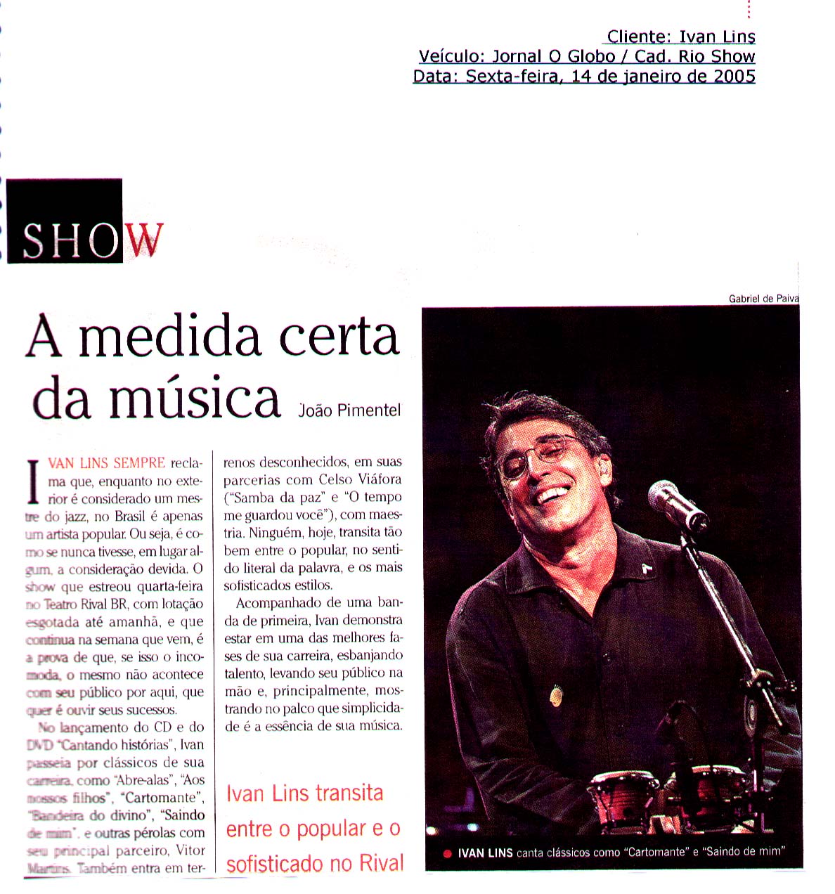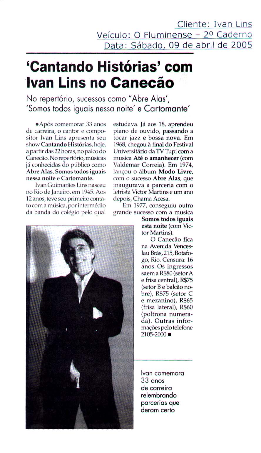 R – Aí eu falei que não fazia, sabe o que eles fizeram? Mandaram alguém dizer: “Não, tudo bem, vai ser como você quer.”. Só que me botaram em um camarim sem televisão, eu não escutava nada; botaram a banda no palco, Flávio Cavalcanti? chegou e falou: “Agora, no ar, Pout Pourri de Sucessos!” E eu lá, sem saber o que era. Me trouxeram, sem eu saber o que era, aí: “Ivan Lins!”, e eu estava crente que estava no meu quadro, feliz da vida, a sorte foi que eu toquei Madalena primeiro. Quando eu entrei na segunda, ele parou a música no meio: “Pode parar, pode parar. Você está pensando que meu programa é o quê, você vem aqui para usar meu programa? Isso aqui é Pout Pourri de Sucessos!”. Quando ele falou Pout Pourri de Sucessos eu falei: “Caramba!”. E o gozado porque quando eu entrei a banda estava desesperada, nego fazendo careta para mim e eu, no meu mundo, nem prestei atenção, nem vi.