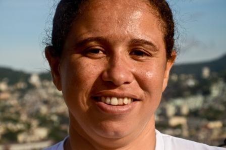 R – É o que eu falo, eu quero fazer Administração, mudar um pouco o ramo. Eu fiz Pedagogia Empresarial, mas que queria fazer outra faculdade, queria não, pretendo fazer, nem que seja dentro de casa. Meu tio é biólogo, então ele é inteligente para caramba, nem que ele me dê um apoio nas aulas. Assim para estudar em casa, porque tem isso, não tem? A distância? Faculdade? Porque quatro filhos é uma correria danada. Eu assim, a minha filha chega da escola, a especial, ela não anda e não fala, então ela sempre puxa mais o meu tempo, não é nem o bebê. Bebê tem o pai dele e tem creche o dia todo. E ela também foi da creche, mas ela que puxa mais o meu tempo. E assim, eu estou nesse ramo não sei até quando, chega no Favela Point, vamos ver até onde eu vou durar, até onde eu estiver, eu vou fazer por onde. E tenho certeza também que, quando eu sair, vão ouvir falar de mim, que eu não vou ser qualquer desistência. Eu vou ser a desistência. Eu estou me sentindo pressionada nesse momento, sinceramente, não sei o que eu penso na vida, o que eu quero, desde esse início do Favela Point, as coisas na minha mente atribularam um pouquinho, eu estou muito, me sentindo esmagada. Mas, assim, o que eu peço a Deus é força, saúde, disposição para que eu continue trabalhando seja no que for. Que eu esteja me satisfazendo para que eu possa criar meus filhos. Eu acho que essa é a minha maior perspectiva na minha vida, é criar os meus quatro amores. Que sem mim, vai cada um para cada canto, vai acabar a minha família segurando a onda, e Deus me livre, nem pensar. Eu quero criar, estar aqui, ver o desenvolvimento, passar, eu falo sempre para elas, não queiram a vida da mamãe. Queira a minha luta, a minha força; mas não quero a vida que eu tive para vocês. Eu ganhei uma bolsa para a França, por melhor aluna da escola, tanto do técnico, quanto do Magistério Científico na Bahia. Meu pai não assinou para eu ir, estou louca para ir. Eu sei o hino da França até hoje, eu sei cantar o hino da França. E o meu pai não assinou.
