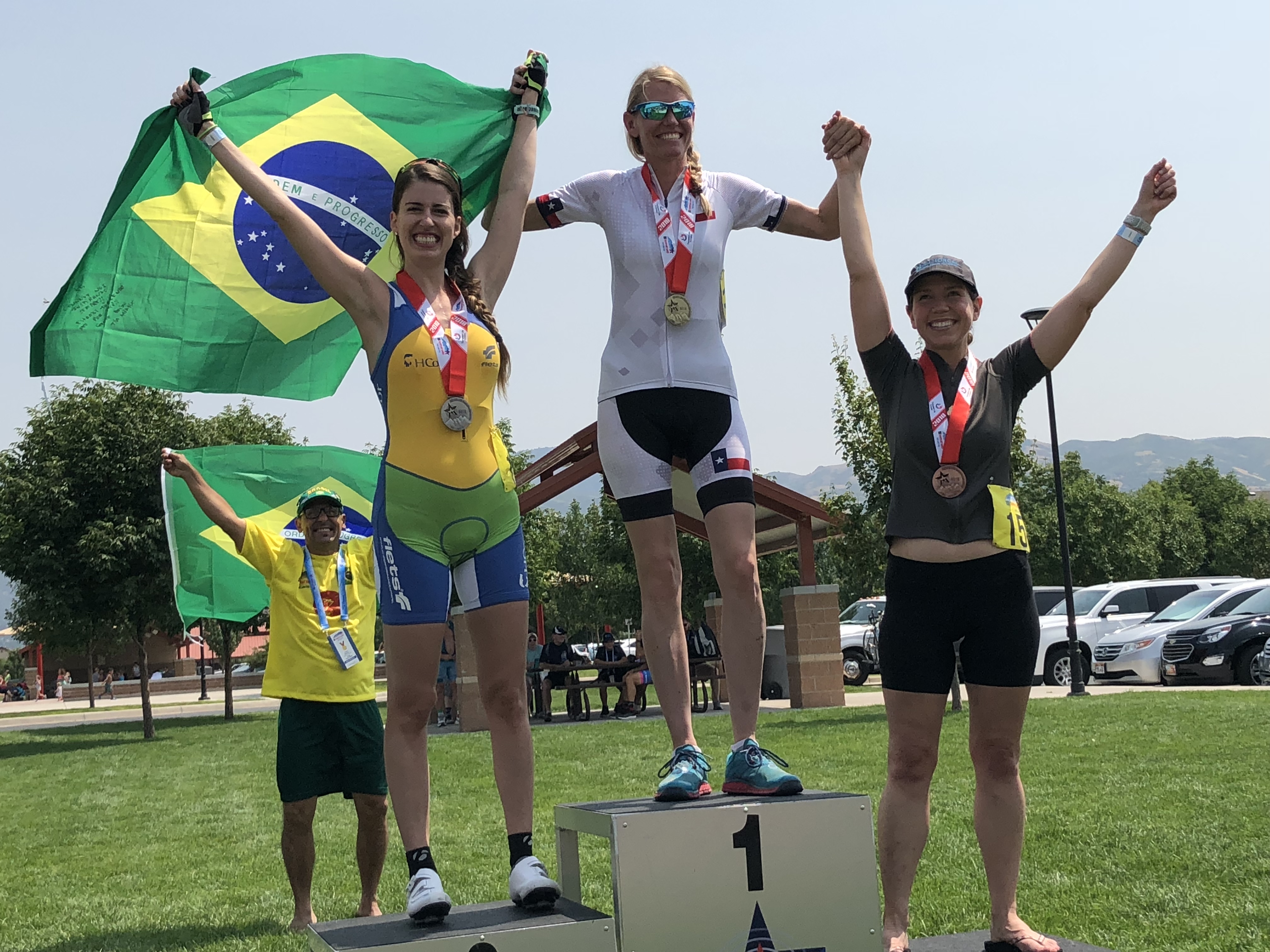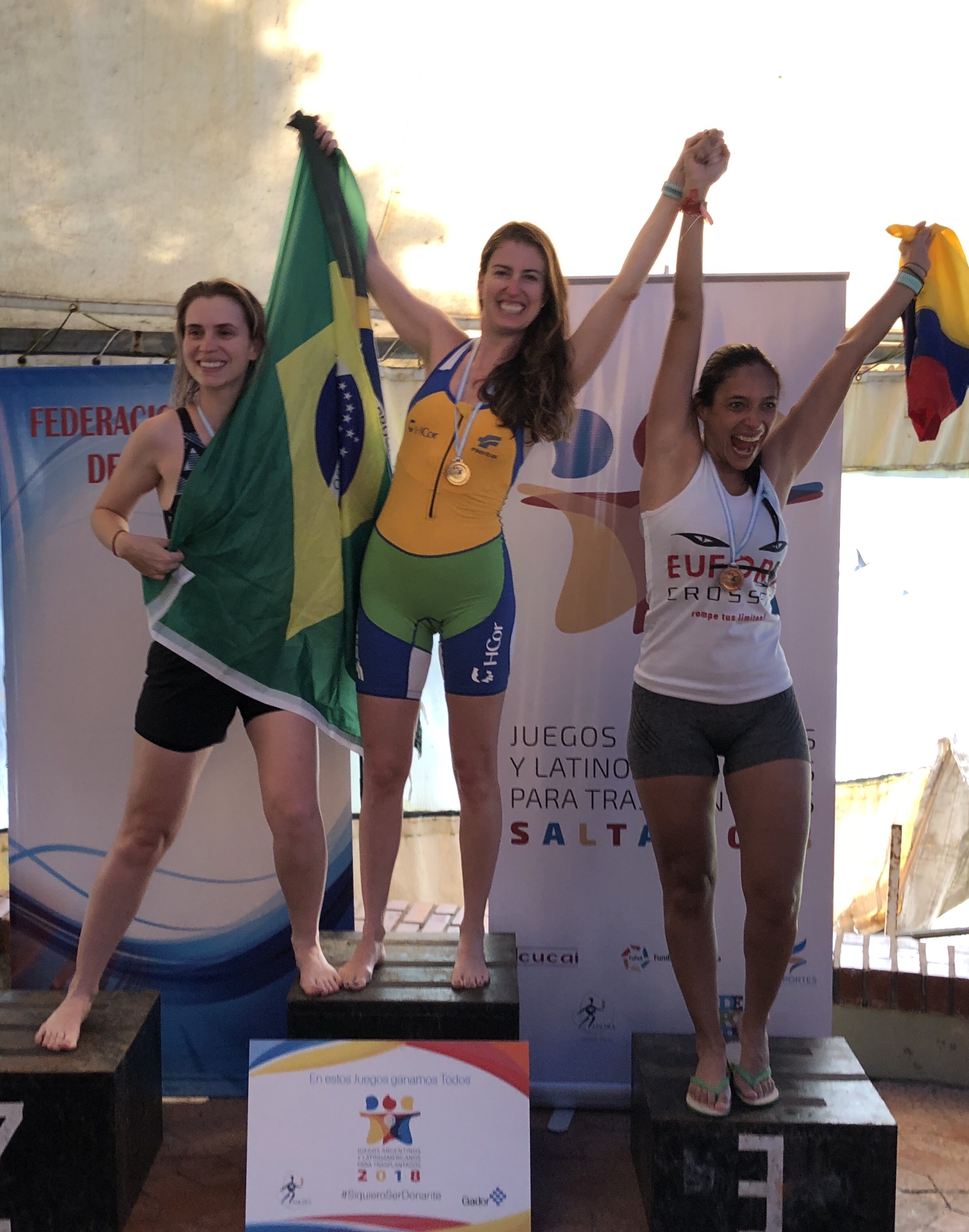 R – Esta aqui foi na Espanha. Esta aqui foi dos Jogos Americanos para Transplantados. Esta foi a minha primeira medalha, medalha, que eu ganhei. Nas Olimpíadas, eu não tenho vergonha de dizer, eu fui a última a chegar, mas não tem problema, porque antes eu nem podia fazer nada, então, eu fui a última a chegar. Gente, eu comemorei tanto, quando eu bati a mão na piscina, que foi a última etapa – no triatlo dos transplantados é um pouco diferente, então, primeiro, a gente corre, depois a gente pedala, depois a gente nada, em dias separados, cada coisa em um dia. Então, quando eu bati a mão na piscina, eu olhei para: “Uhu!”, tem foto disso. Nas Olimpíadas, eu fui a última a chegar, mas, quando eu fui para os Jogos Americanos Transplantados em Salt Lake City, nos Estados Unidos – gente, olha o que eu tô falando, fui para os jogos em Salt Lake City, eu tô me sentindo uma atleta –, eu ganhei medalha de prata no ciclismo. Quando eu ganhei, eu não acreditei. Quando eu perguntei... Minha prova foi linda, foi maravilhosa, eu amei. Aí, eu fui ver o meu tempo, quando eu olhei lá: dois. Falei: “O que é dois?”, eu não associei. Aí, eu fui perguntar, eu falei: “O que é dois? Dois ganha alguma coisa?”. Eles olharam pra mim, tipo assim: “Sua idiota”. E eu ganhei medalha de prata, foi a primeira medalha que eu ganhei. Nem precisava ganhar, só fazer já estava ótimo. Podia ser a última, eu sou muito boa em ser a última. Aqui, eu fui, no final, campeã americana de triatlo, nessa competição. Aqui, são outras medalhas dessa competição também. Aqui eu fui para os Jogos Latino-Americanos dos Transplantados, na Argentina, fui campeã latino-americana de natação. Esta daqui foi no triatlo, eu fui prata. Esta daqui é muito legal, foi a minha primeira prova de mar, uma das coisas que eu mais gosto hoje em dia, nadar no mar. Pra mim, fiquei tanto tempo presa dentro de um hospital, nadar no mar, você não tem noção, você está respirando, você olha o morro, você está na água, é o ápice, porque é como se você tivesse 360 graus, sei lá, 3D, todo envolto em muita vida, muita natureza, muito maravilhoso.