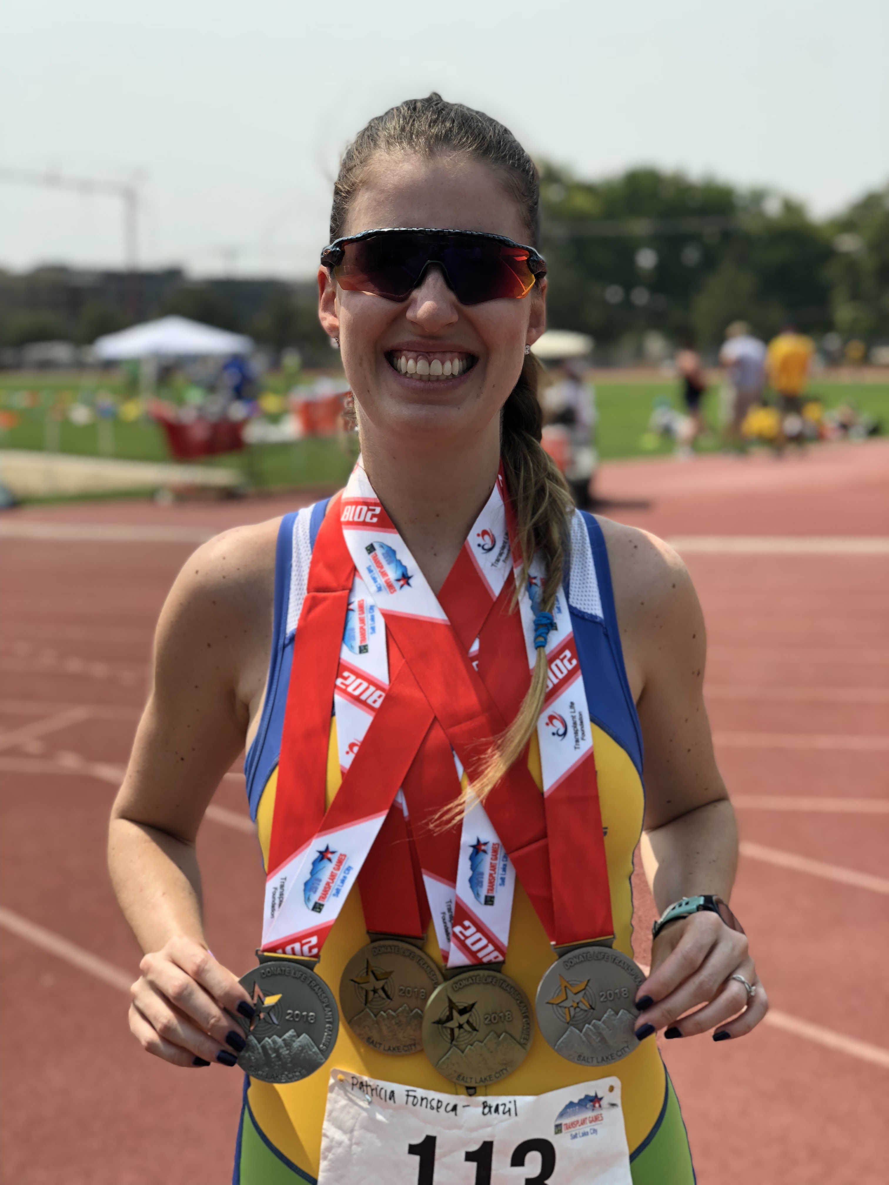 R – Apresento. Essa daqui foi da minha primeira corrida de rua, que foi a corrida da Rolling Stones. Foi muito legal, até me anunciaram na chegada: “Está chegando a Patrícia, transplantada de coração, vem Patrícia, vem Patrícia”. Foi sensacional. Aí, as de competição mesmo, tem essa daqui que é das Olimpíadas dos Transplantados.